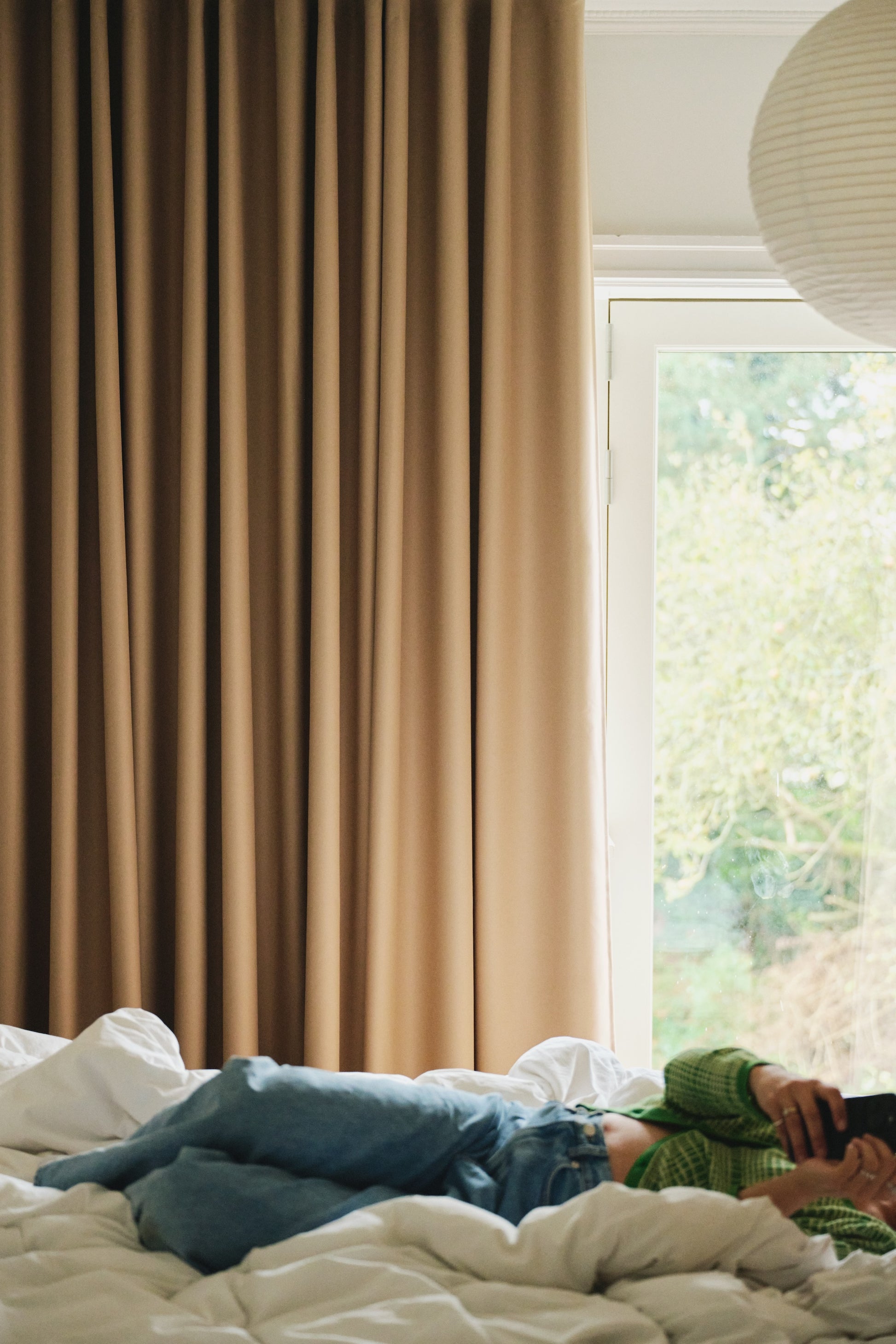 Vores shiny satin-gardin er det mest lysdæmpende i kollektionen – en elegant løsning til rum, hvor du ønsker ro og afskærmning. Stoffet har en tæt vævning og en ensfarvet, glat overflade på begge sider, hvilket giver et gennemført og stilrent udtryk fra alle vinkler.